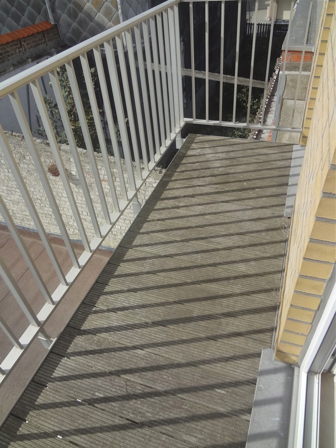 Langs de achterkant, zonnekant, is er een mooie terras met plaats voor een tafel en twee stoelen.