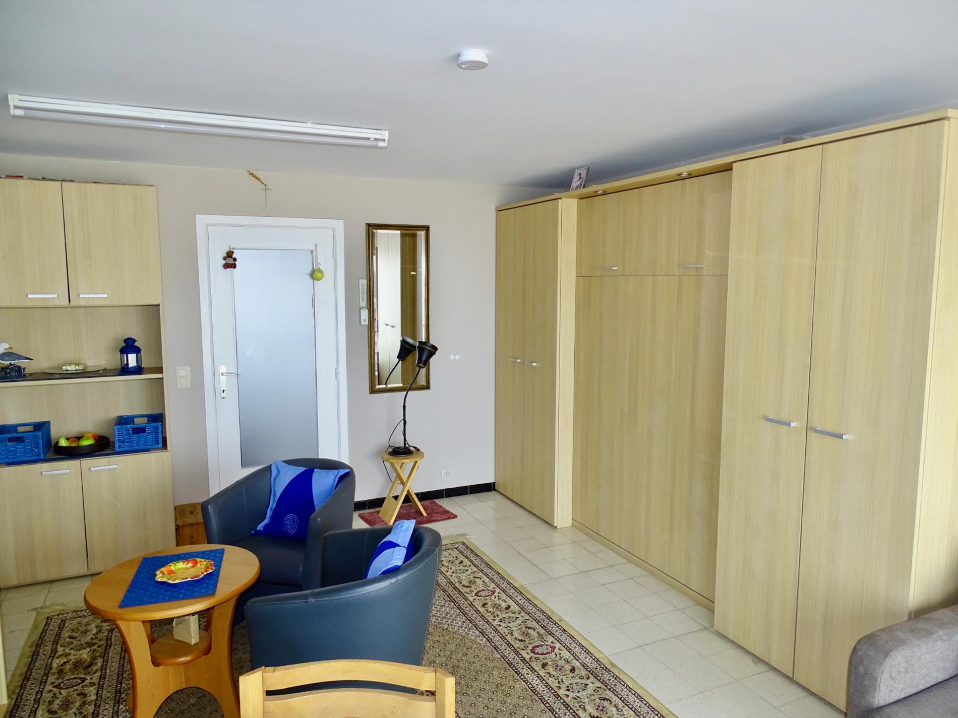 Gelegen langs het rustige gedeelte van de Zeedijk te Wenduine bevindt zich deze gemeubelde studio met frontaal zeezicht. De ruime woonkamer geeft uit op een klein terras, in de woonkamer is er naast een divanzetel ook een kastbed met volwaardige matras aanwezig. De keuken is goed uitgerust en onberispelijk onderhouden. In de badkamer is er een toilet, een lavabo en een bad met mogelijkheid tot het nemen van een douche.