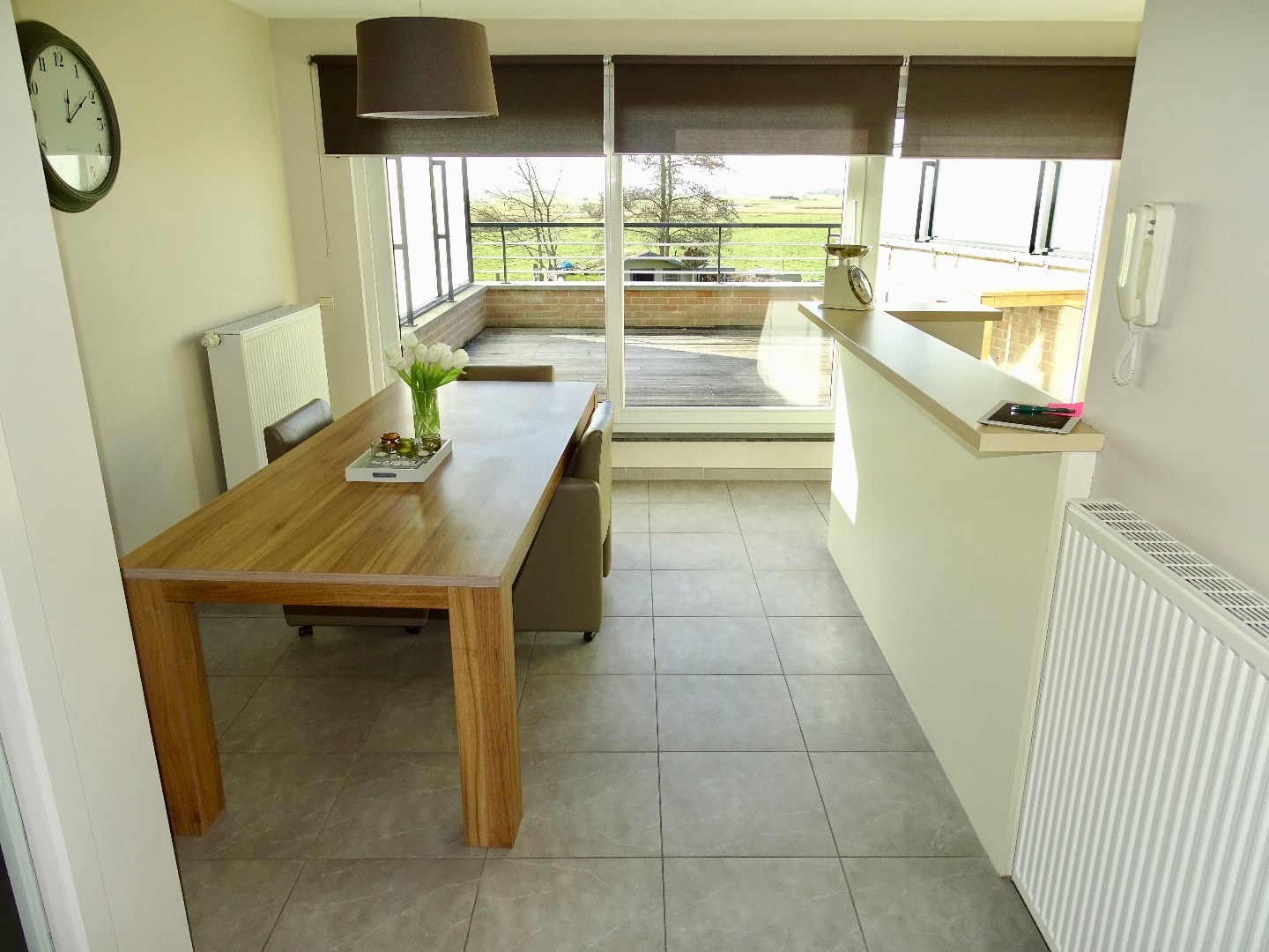 Op het woonniveau geniet je dankzij de doorzonwoonkamer steeds van zeer veel lichtinval. De woonruimte geeft uit op een mooi zonneterras met een prachtig zicht over de achterliggende velden. De keuken is volledig ingericht en aangrenzend bevindt zich een praktische berging. Verder een apart toilet en een trap naar het slaapniveau.