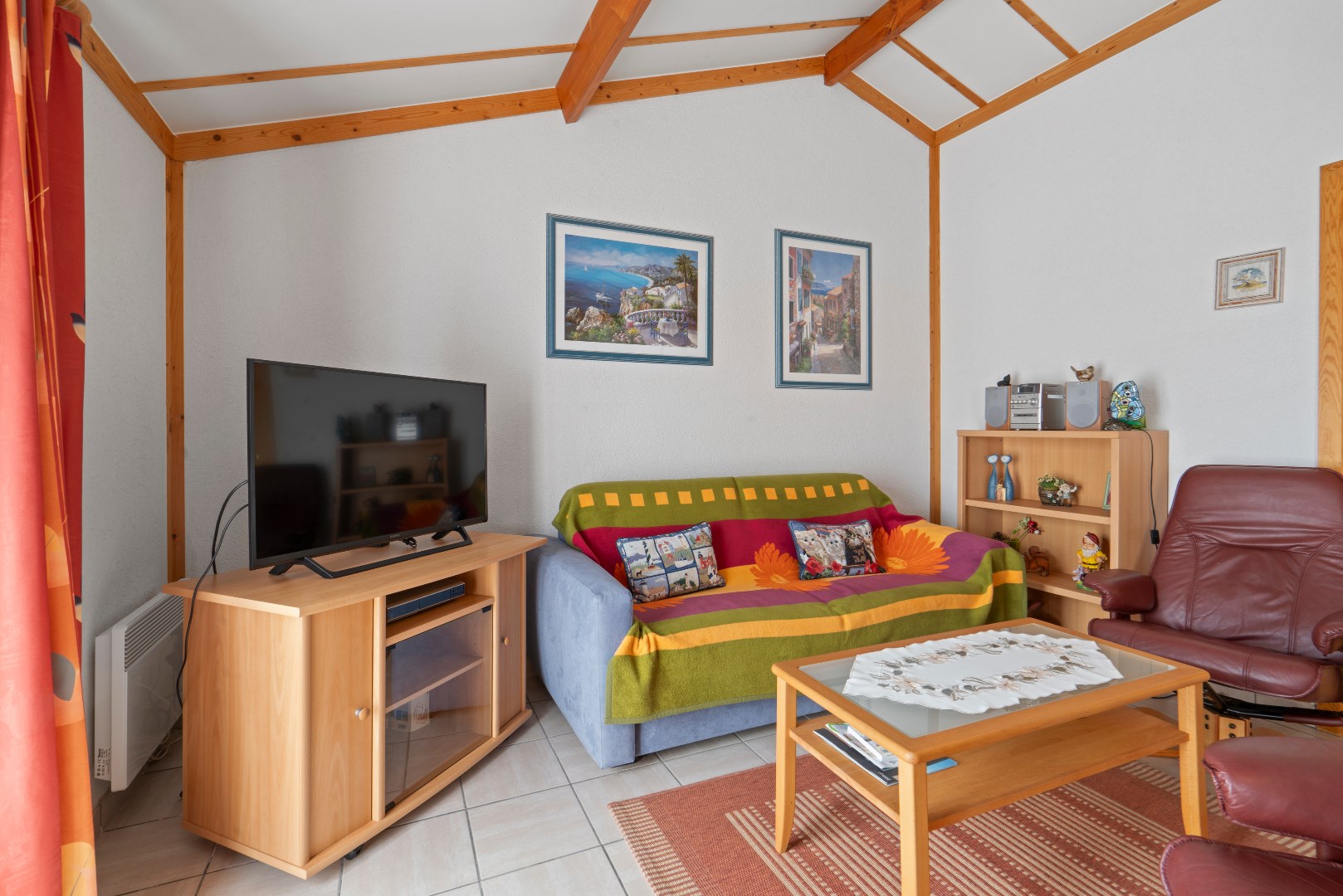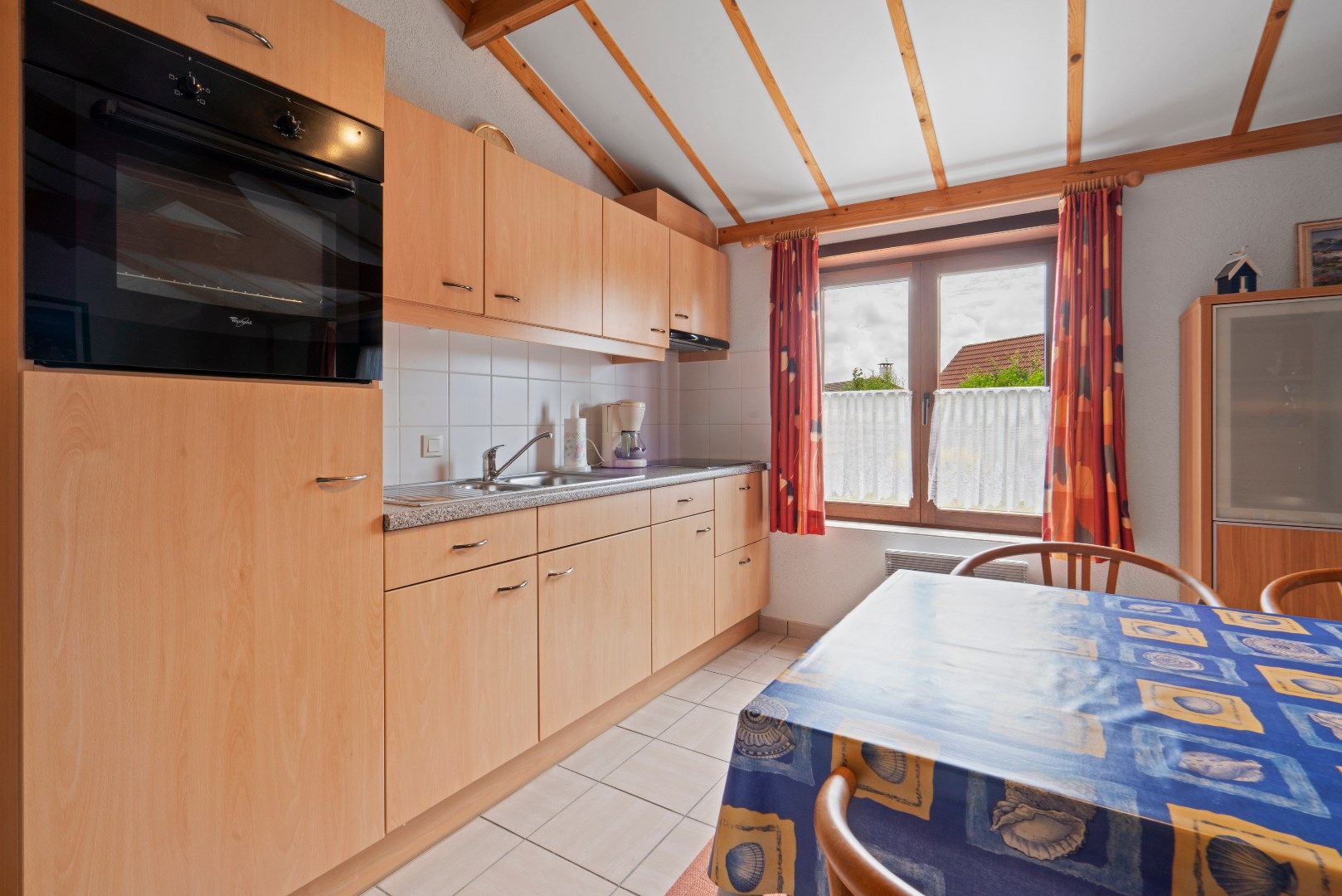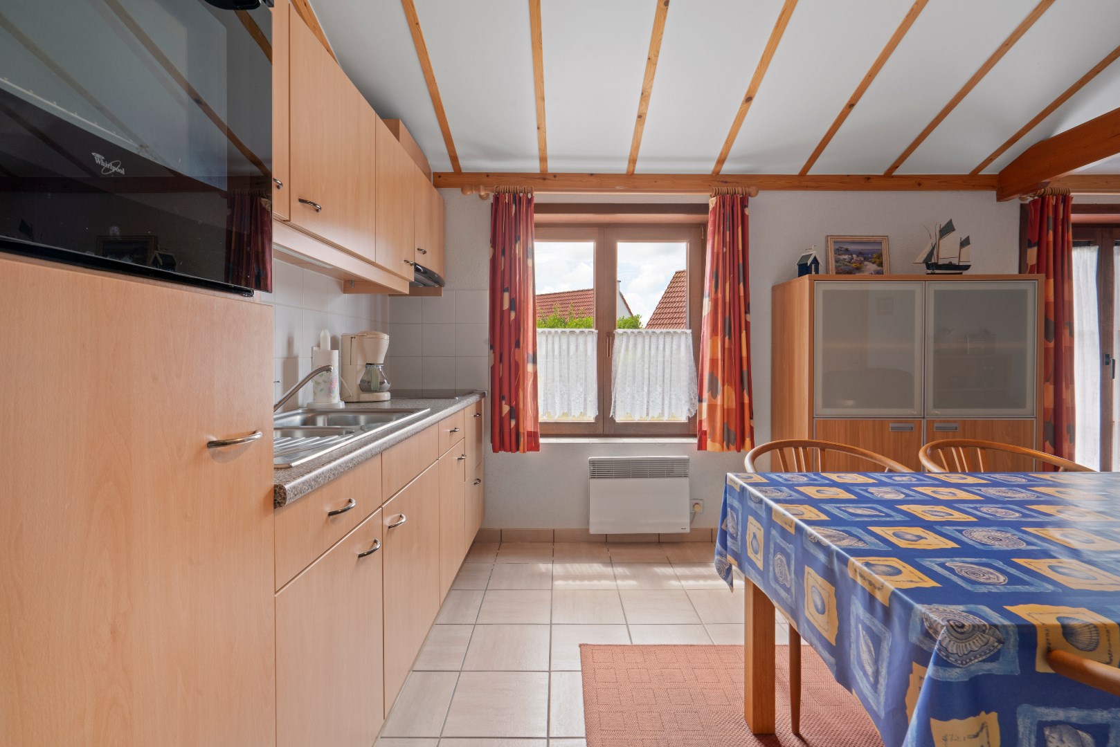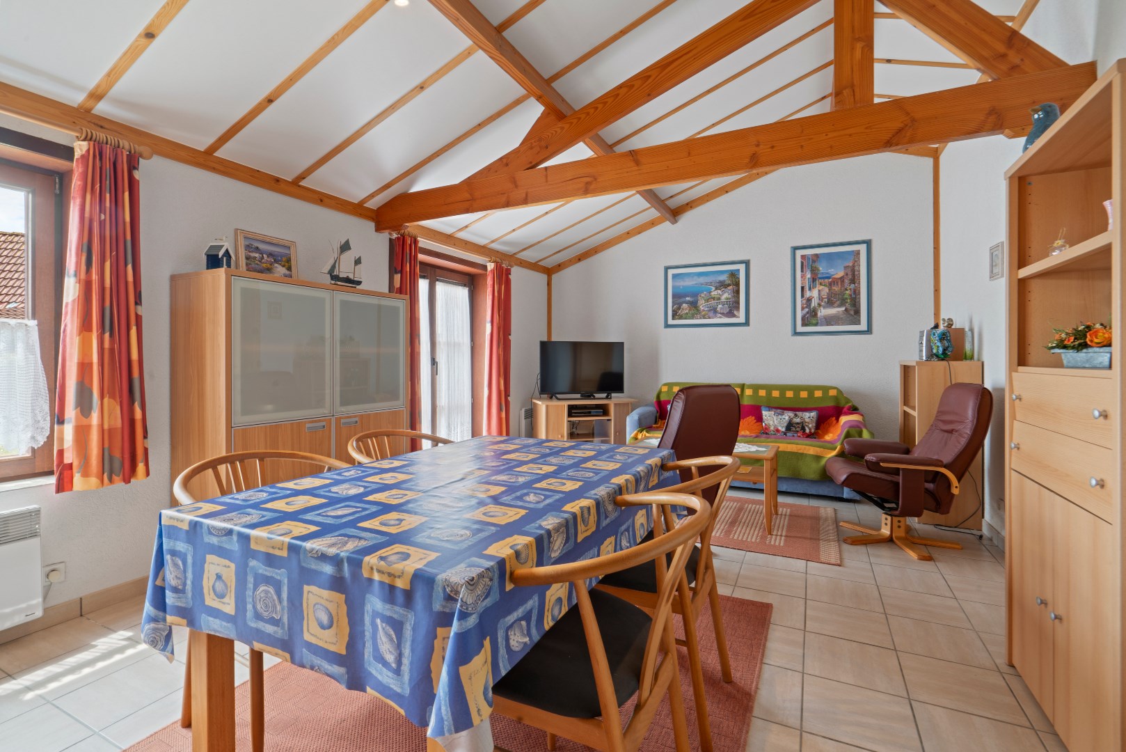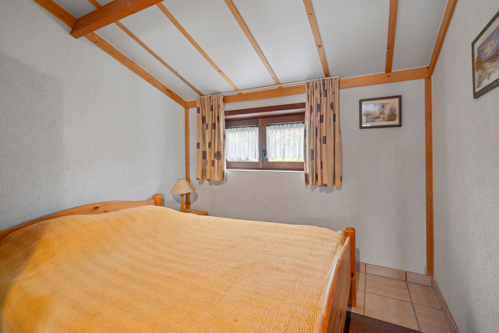 Op het gelijkvloers bevindt zich de woonkamer met open ingerichte keuken, badkamer met ligbad en een badkamermeubel, alsook een praktische berging. Er zijn twee slaapkamers, één met plaats voor een dubbel bed en een tweede slaapkamer met plaats voor een enkel of stapelbed.