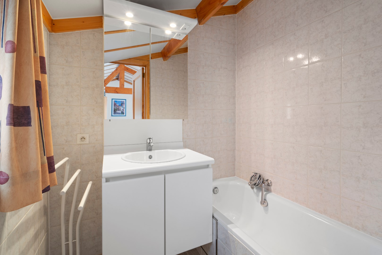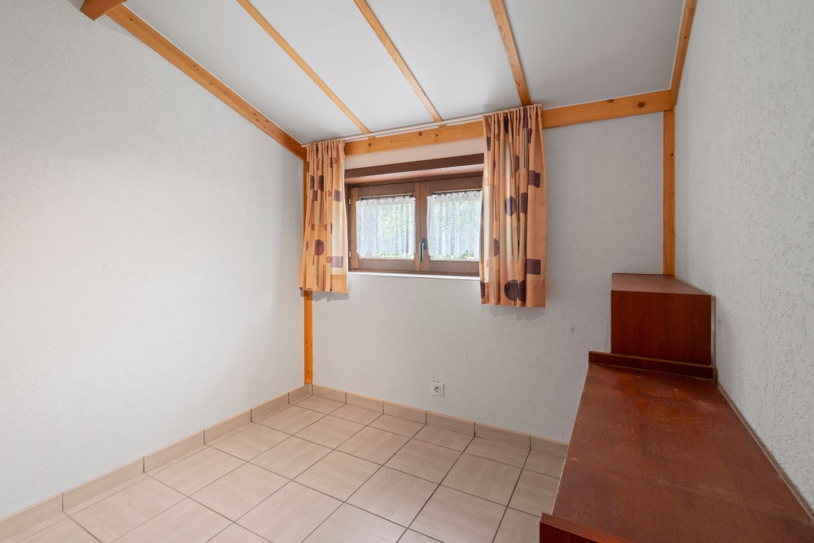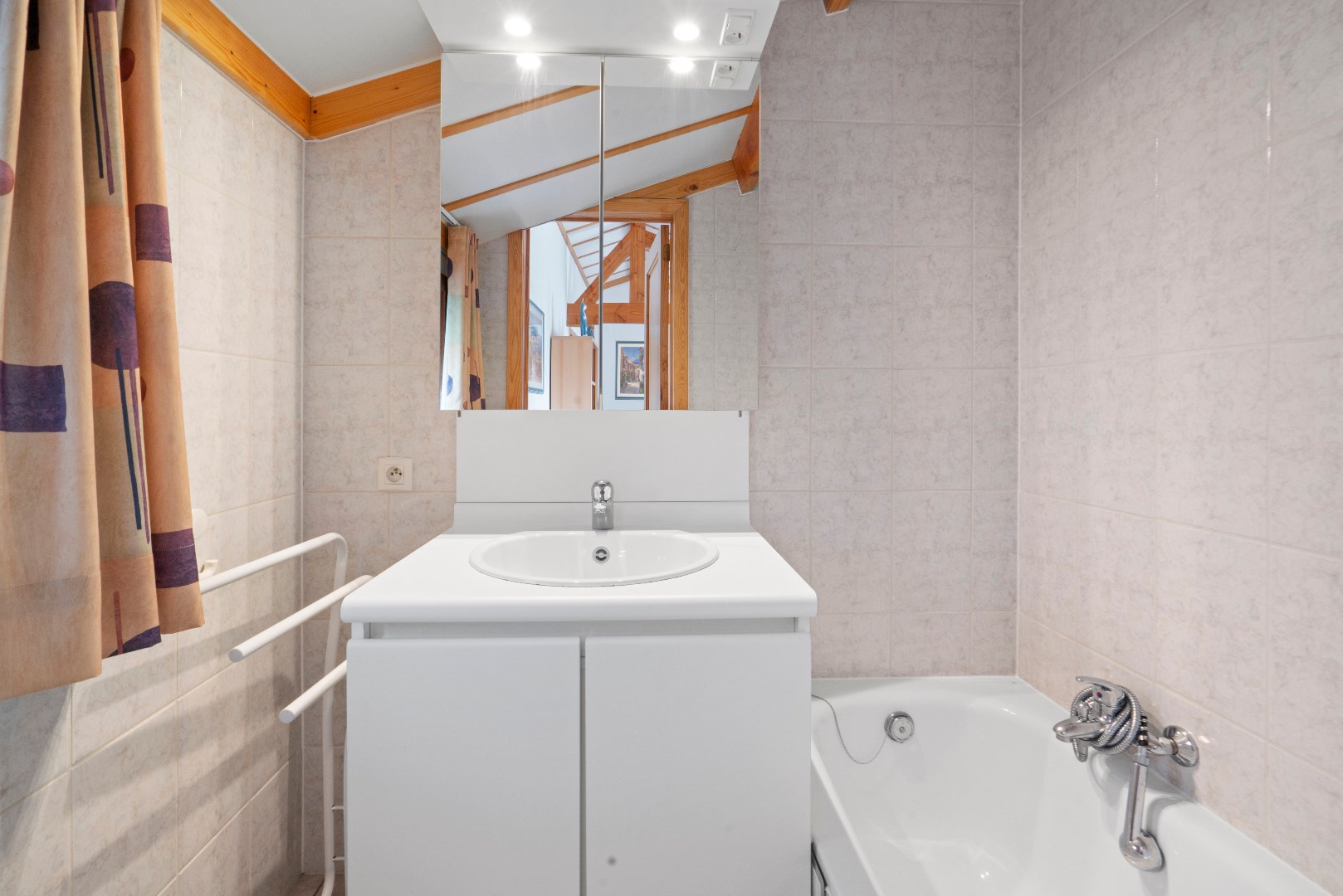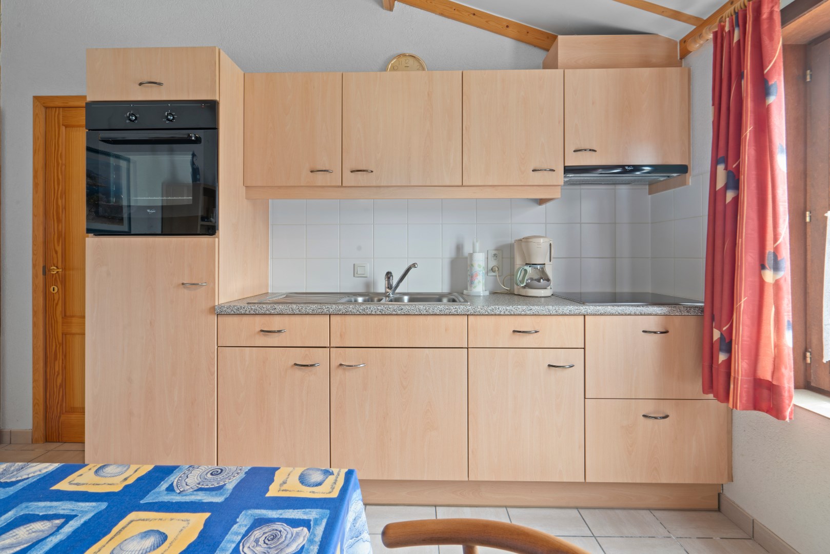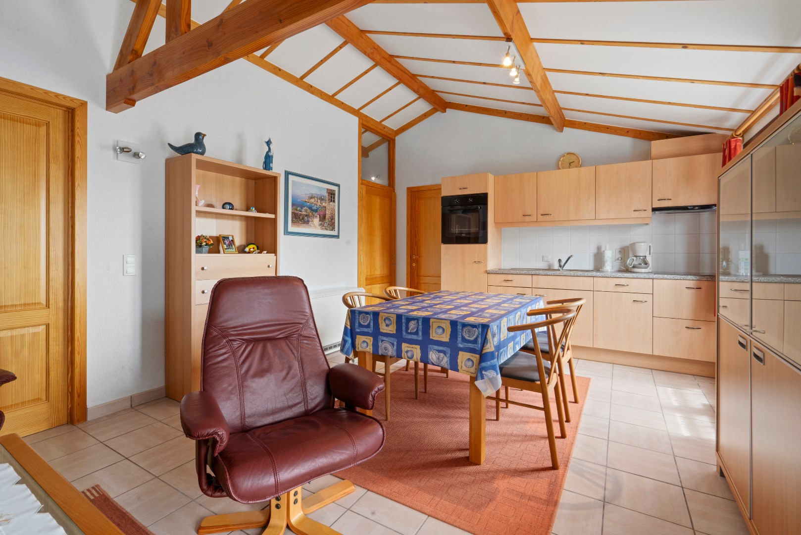 Op het gelijkvloers bevindt zich de woonkamer met open ingerichte keuken, badkamer met ligbad en een badkamermeubel, alsook een praktische berging. Er zijn twee slaapkamers, één met plaats voor een dubbel bed en een tweede slaapkamer met plaats voor een enkel of stapelbed.